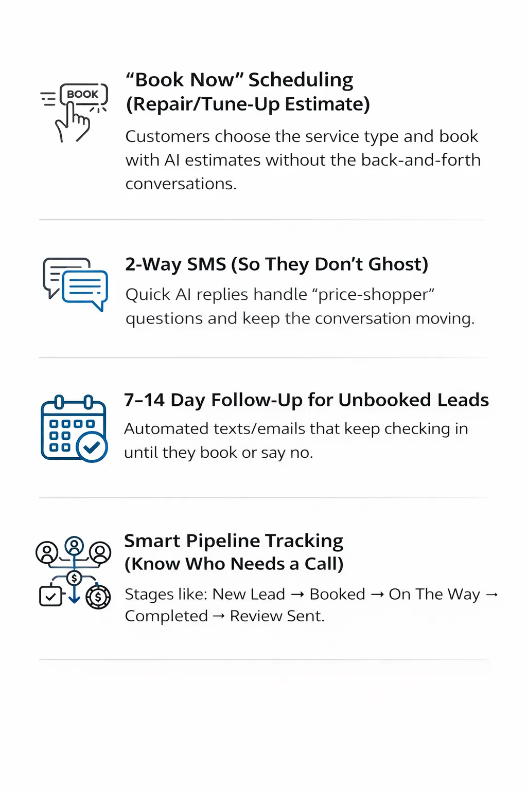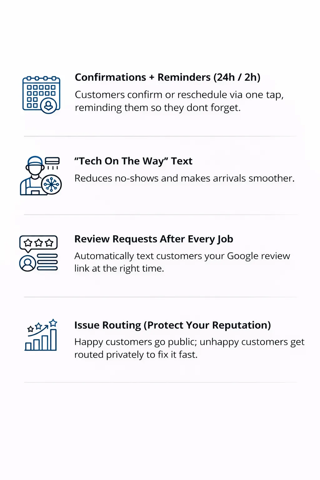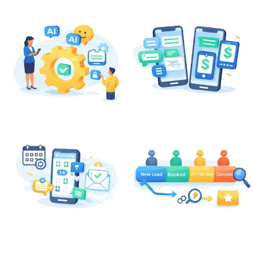 Missed-call text back, fast lead response, confirmations, and review requests, all in one simple system.