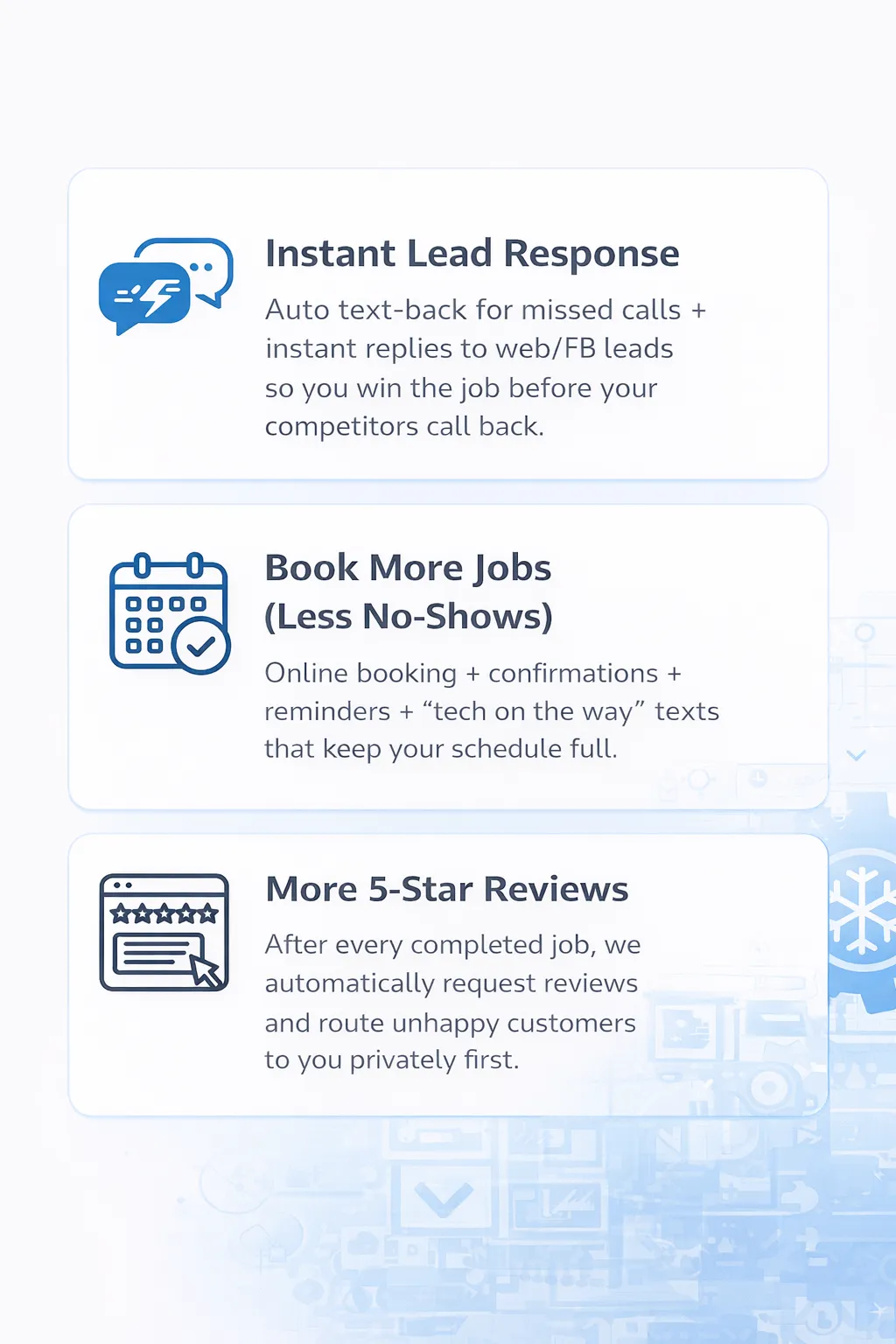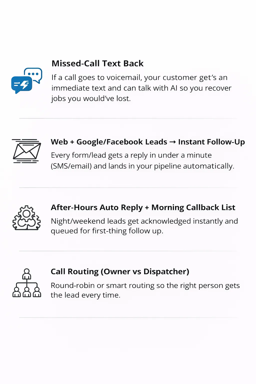 Auto text-back for missed calls + instant replies to web/FB leads so you win the job before your competitors call back.